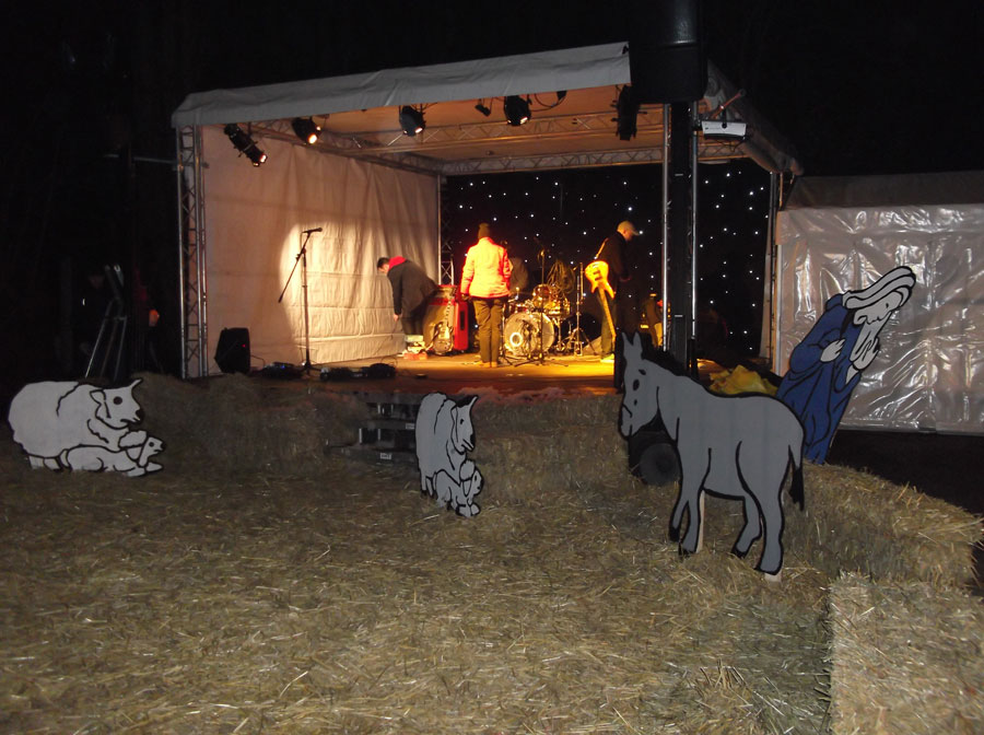 The stage area is 16ft x 16ft (4.8m x 4.8m). It is made from eight (8) 8ft x 4ft decks.